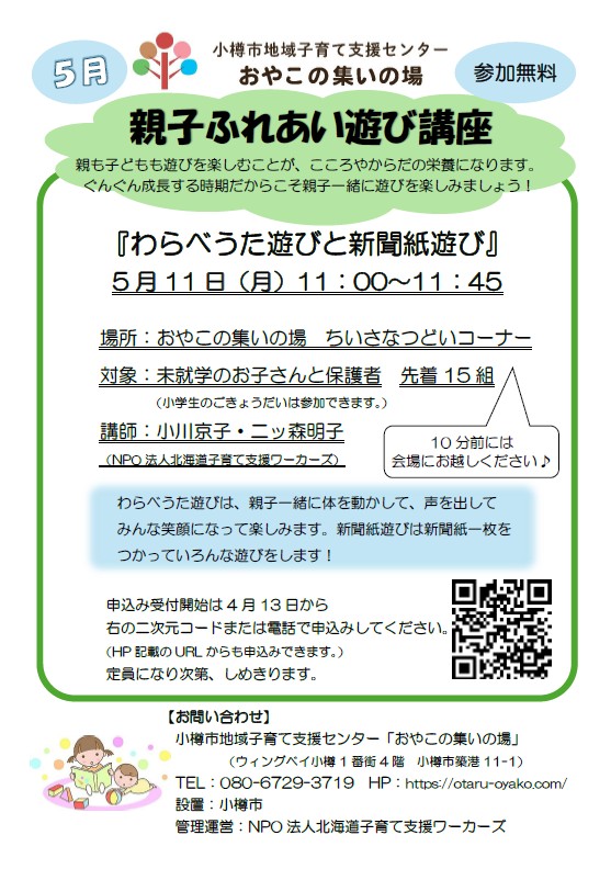 小樽の「おやこの集いの場」は、天候や季節に関係なく気軽に親子が遊び、飲食もできる場所です。毎月、楽しい「親子むけ講座」を開催しています。親も子どもも遊びを楽しむことが、こころやからだの栄養になります。ぐんぐん成長する時期だからこそ 親子一緒に遊びを楽しみましょう!